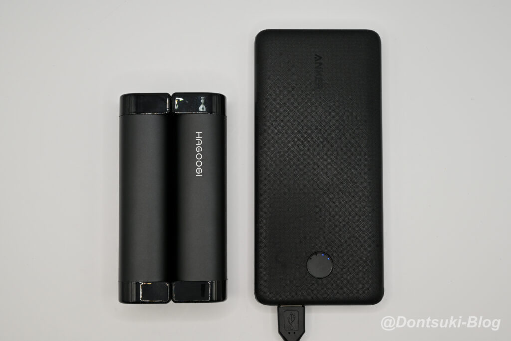 モバイルバッテリーで有名なAnkerの薄型10000mAhモデルと比較すると、『HAGOOGI(ハゴオギ) 充電式カイロ』は非常にコンパクトであることがわかります。