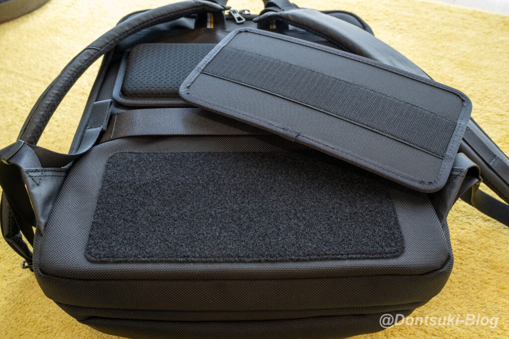 Bumpバックパックの背面パッドは、マジックテープにより取り外しできるため、位置を微調整することで、使用者に合わせたフィッチングを実現しています。