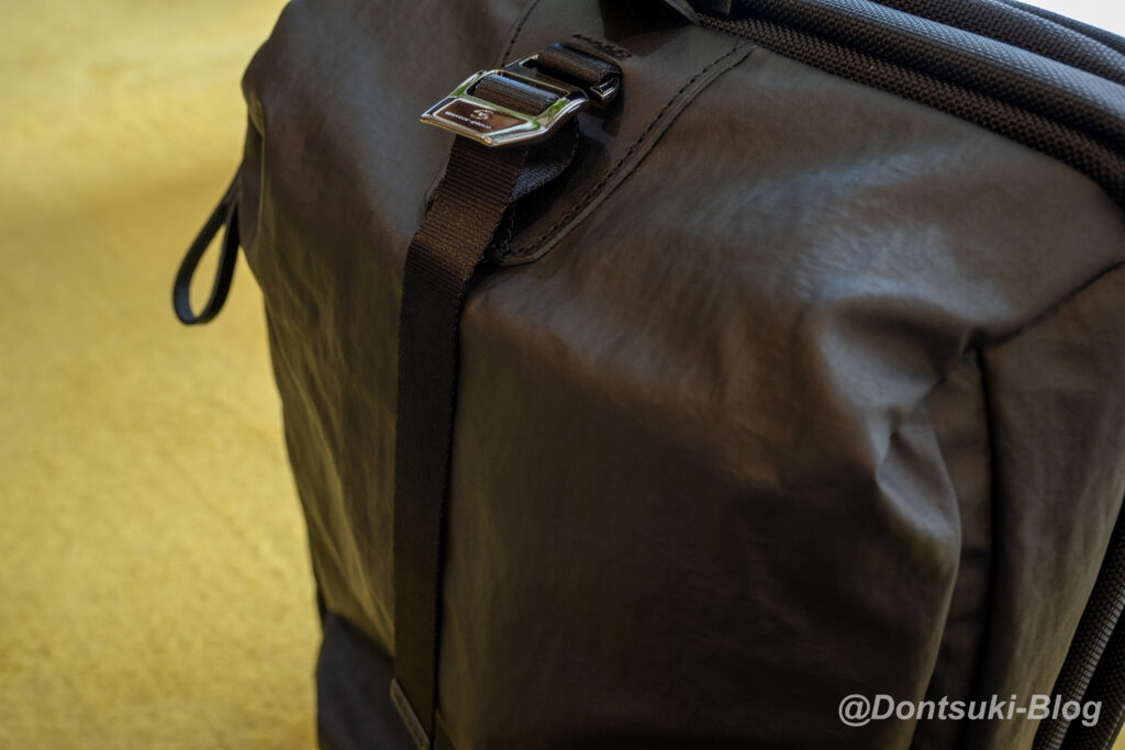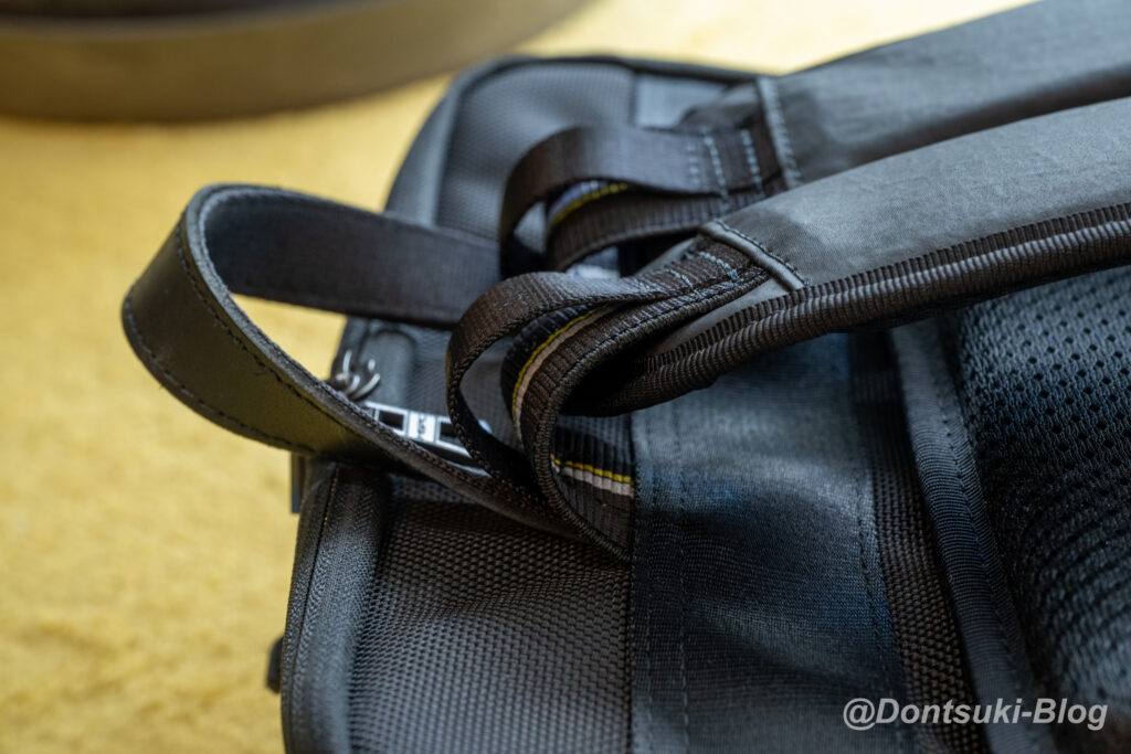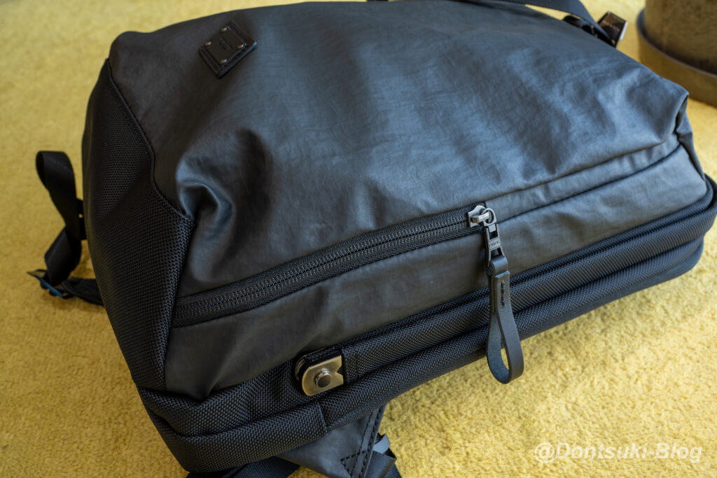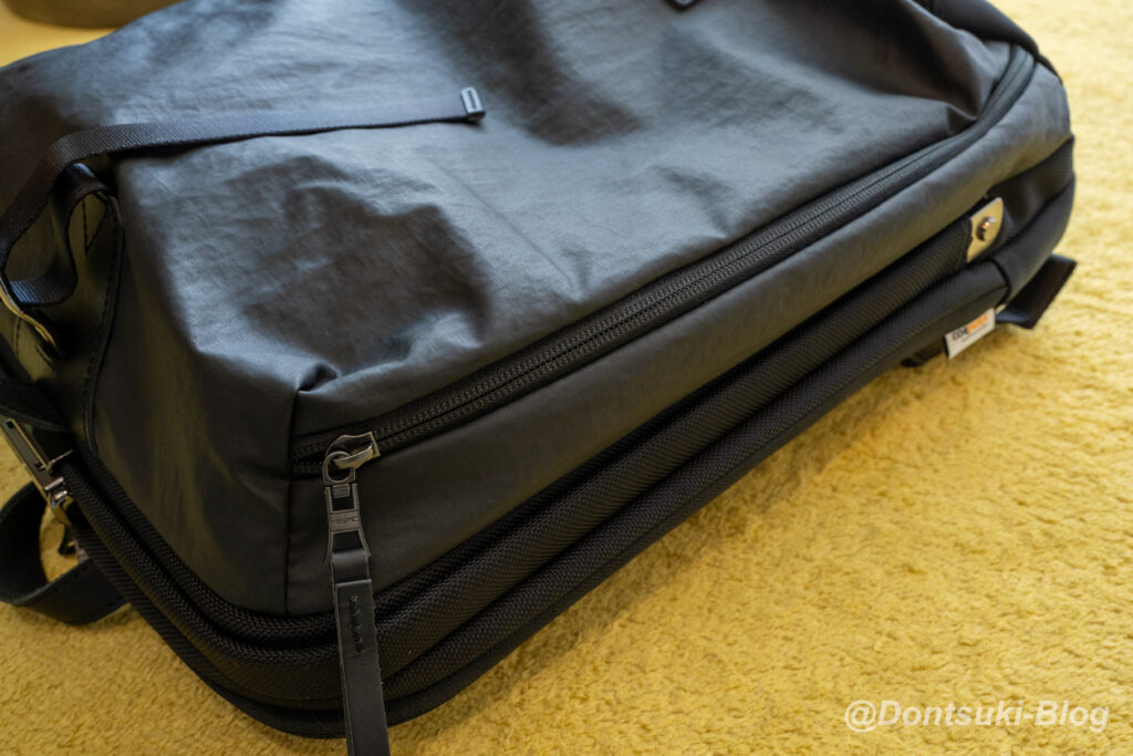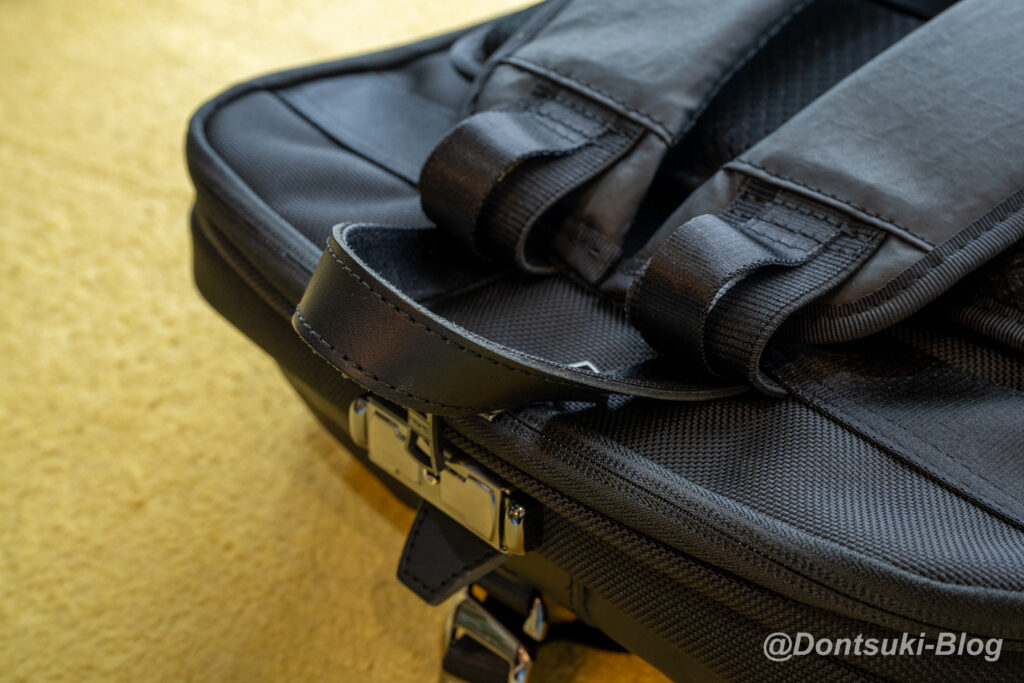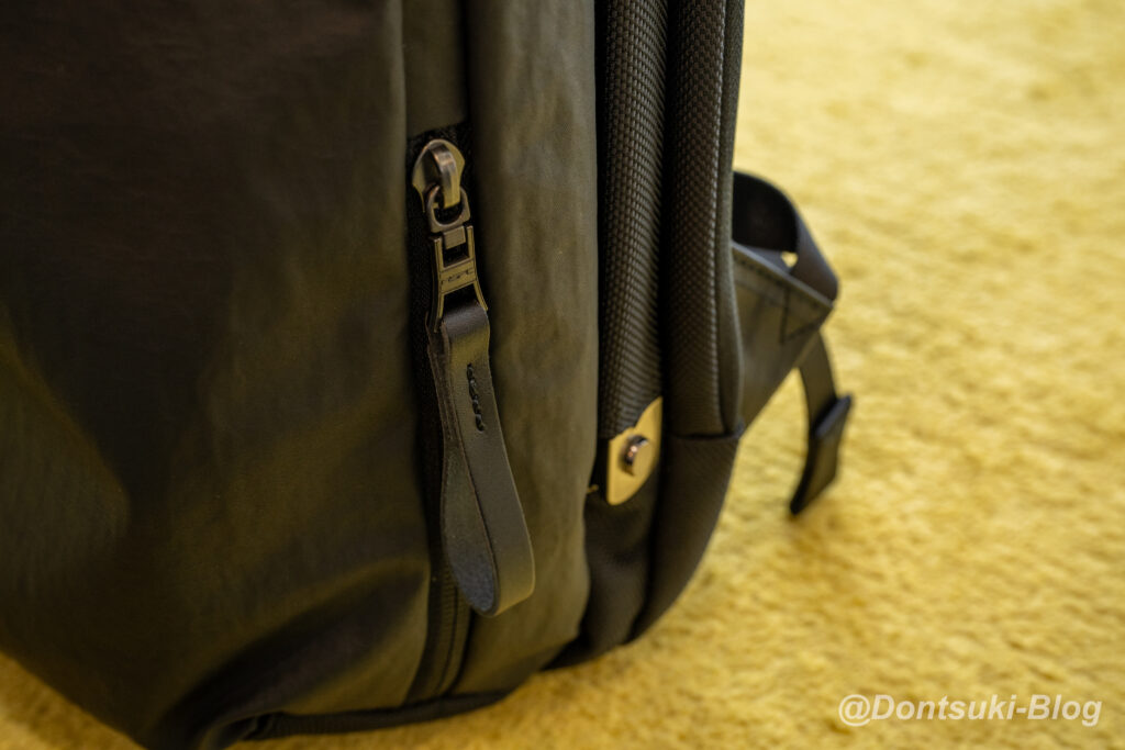 付属記事にもINVISTA 社の1680Dコーデュラバリステックナイロンを使用しており、さらに付属レザーは国産の良質ステアレザーです。他にもフッ素を使わない「3M」社製の防水剤「SCOTCHGARD」で傷がついても維持される防水機能が付与されており、見えないところでも機能が盛りだくさんに詰め込まれています。お値段が高いのにも納得です…!